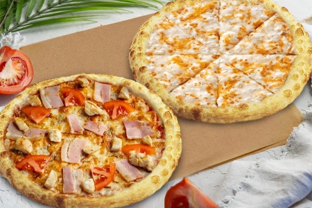 Цыпленок ранч средняя, Сырная пицца средняя.