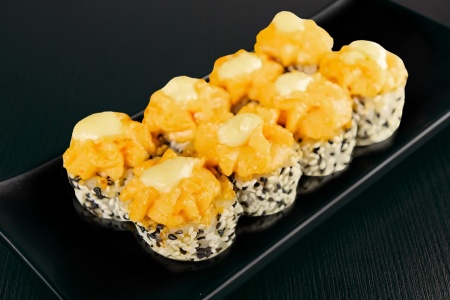 Рис, нори, снежный краб, огурец, сливочный сыр, тобико, темпур.